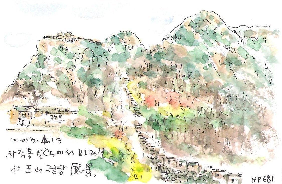 인왕산 산책로를 따라 걸어가다 보면 도로가 크게 S자로 휘어지는 곳이 나온다. 이곳에서 고개를 들어 산위를 바라보면 겸재 그림 속의 커다란 바위산이 금방이라도 쏟아져 내릴 것 만 같다. 이 길을 걸을 때 마다 소나기가 한 차례 지나가 인왕제색도의 안개 속을 걸어보기를 기대해보지만 지금까지 그런 기회를 잡지 못했다. 오늘은 화창한 봄날 그의 그림 안개 속 그 계곡을 혼자 걸어가고 있다.